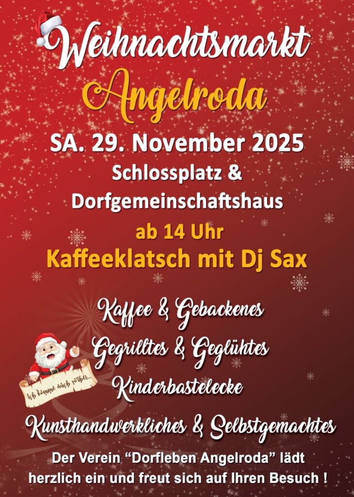 Am 29.11.2025 ab 14 Uhr startet der Weihnachtsmarkt Angelroda auf dem Schlossplatz & Dorfgemeinschaftshaus.