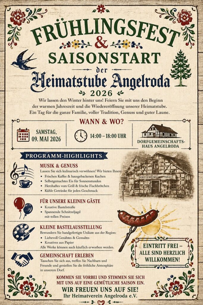 Zum Auftakt laden wir herzlich zu einem Frühlingsfest für Jung und Alt ein. Freuen Sie sich auf einen geselligen Nachmittag in und rund um unsere Heimatstube, mit Zeit zum Entdecken, Wiedersehen und Verweilen. In liebevoller Atmosphäre präsentieren wir unsere Ausstellungsräume und geben Einblicke in die neue Saison 2026. Für das leibliche Wohl und ein Unterhaltungsprogramm ist selbstverständlich gesorgt. Ob als Familienausflug, Treffen mit Freunden oder spontaner Besuch – alle sind herzlich willkommen. Wir freuen uns darauf, gemeinsam mit Ihnen in die neue Saison zu starten!